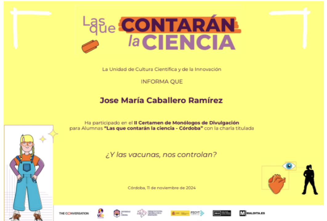 Desde la materia de Cultura Científica de 4º de ESO, se participó en el certamen de monólogos y divulgación para alumnas que se llama “Las que contarán la ciencia” organizado por la Unidad de Cultura Científica y de la Innovación de la Universidad de Córdoba. En la edición del certamen de este año, el alumnado tenía como objetivo desmentir un bulo científico. Tras su participación, recibieron un diploma honorífico.