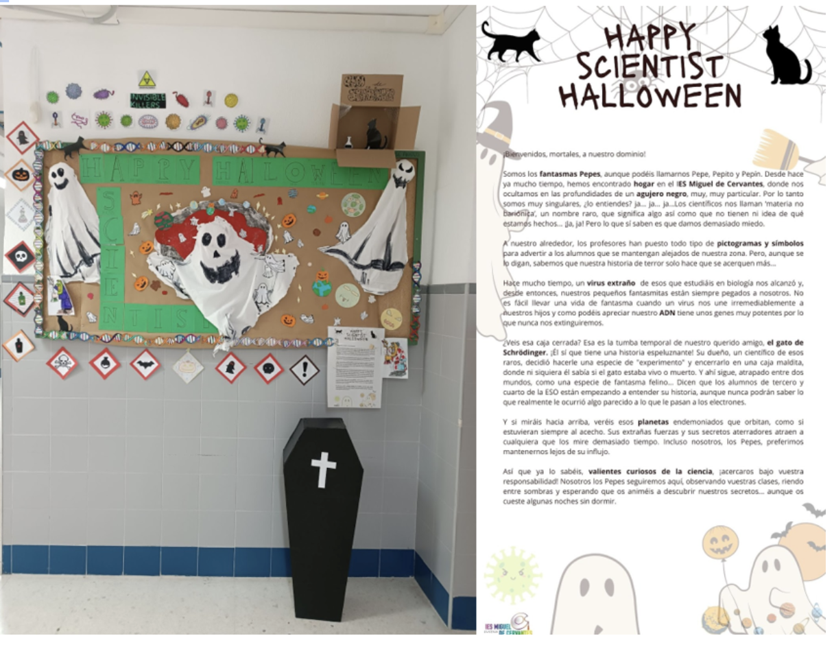 Para ambientarnos en la celebración anual de Halloween, decoramos el tablón de Ciencias de nuestro IES combinando la temática terrorífica de esta fiesta con los aspectos de la Ciencia que son más “aterradores”. De esta forma, pudimos ver que nos acompañó el “zombie” del gato de Schrödinger, algunos virus malignos y los horripilantes fantasmas del agujero negro. En esta actividad participó el alumnado de todos los niveles en las materias de Biología y Geología, Física y Química, Cultura científica, Ámbito Científico-Tecnológico (Diversificación curricular y FPB).